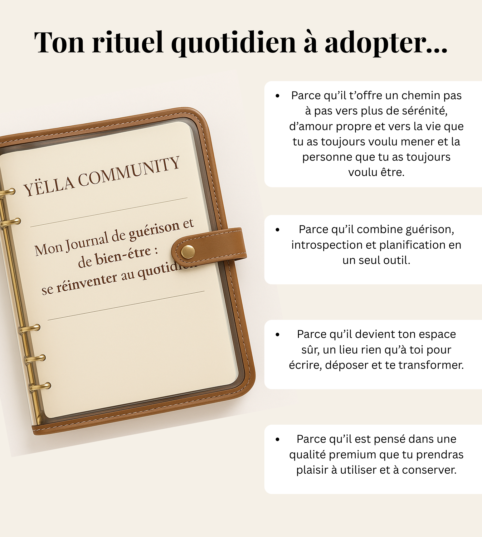Le Journal Yëlla Rituals n’est pas un simple carnet, mais un programme de transformation guidé qui devient ton compagnon intime pour guérir, te réinventer et cultiver ton bien-être au quotidien.